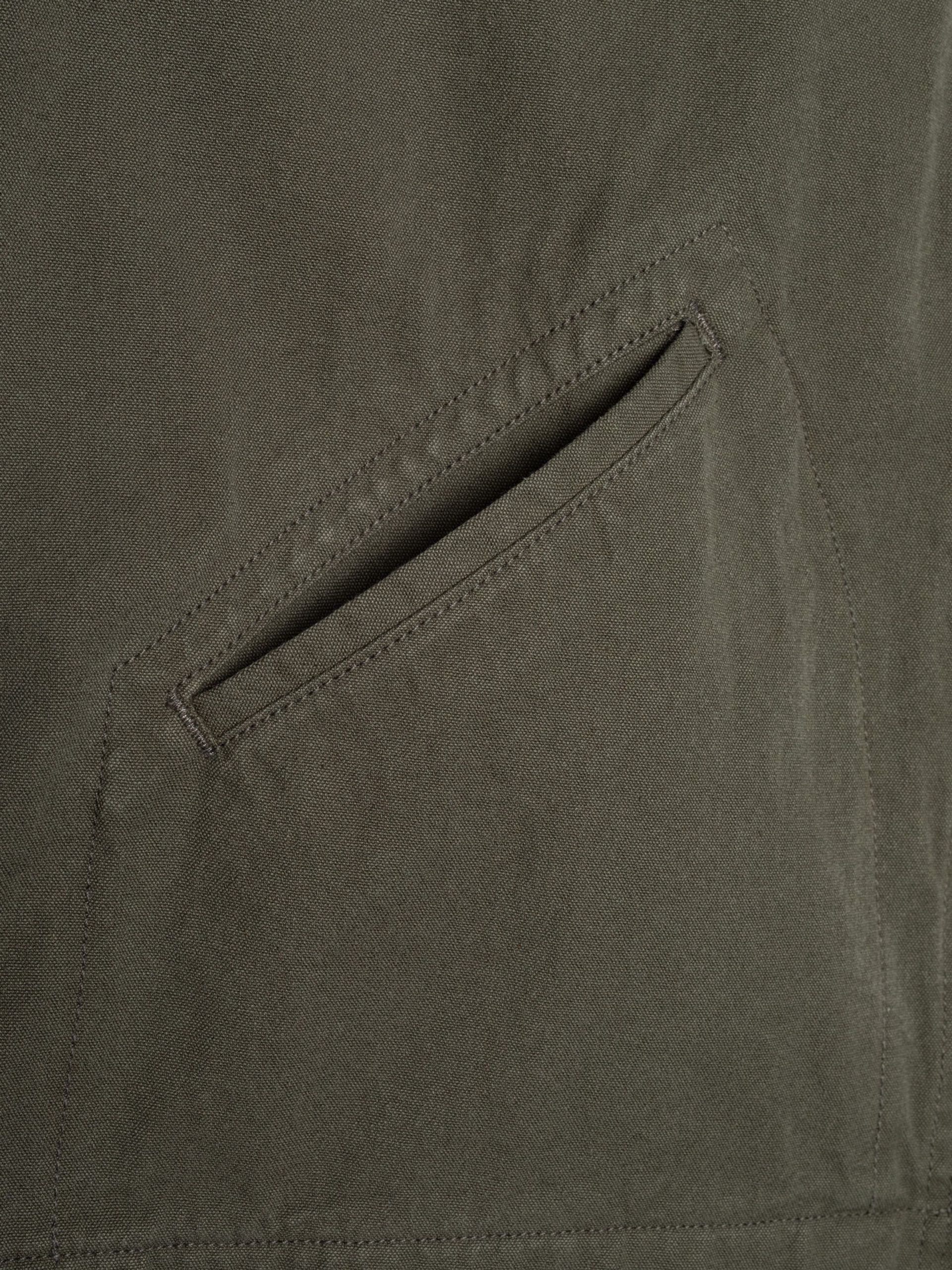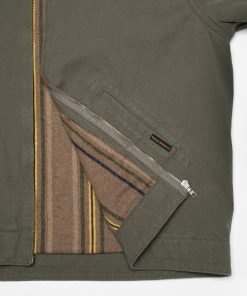The Blake jacket features a regular fit with a short, boxy silhouette, staying true to the essence of a classic worker jacket. Designed for warmth and mobility, the body is lined with a wool-mix blanket, while the sleeves are lined with a blend of cotton and recycled polyamide for ease of movement. The collar, crafted from the same Duck Canvas in a deeper shade of green, provides a subtle tonal contrast, enhancing its workwear aesthetic. Detailed with tonal stitching and curved welt pocket stitching, this jacket masterfully blends vintage inspiration with practical functionality.