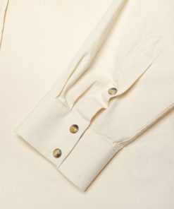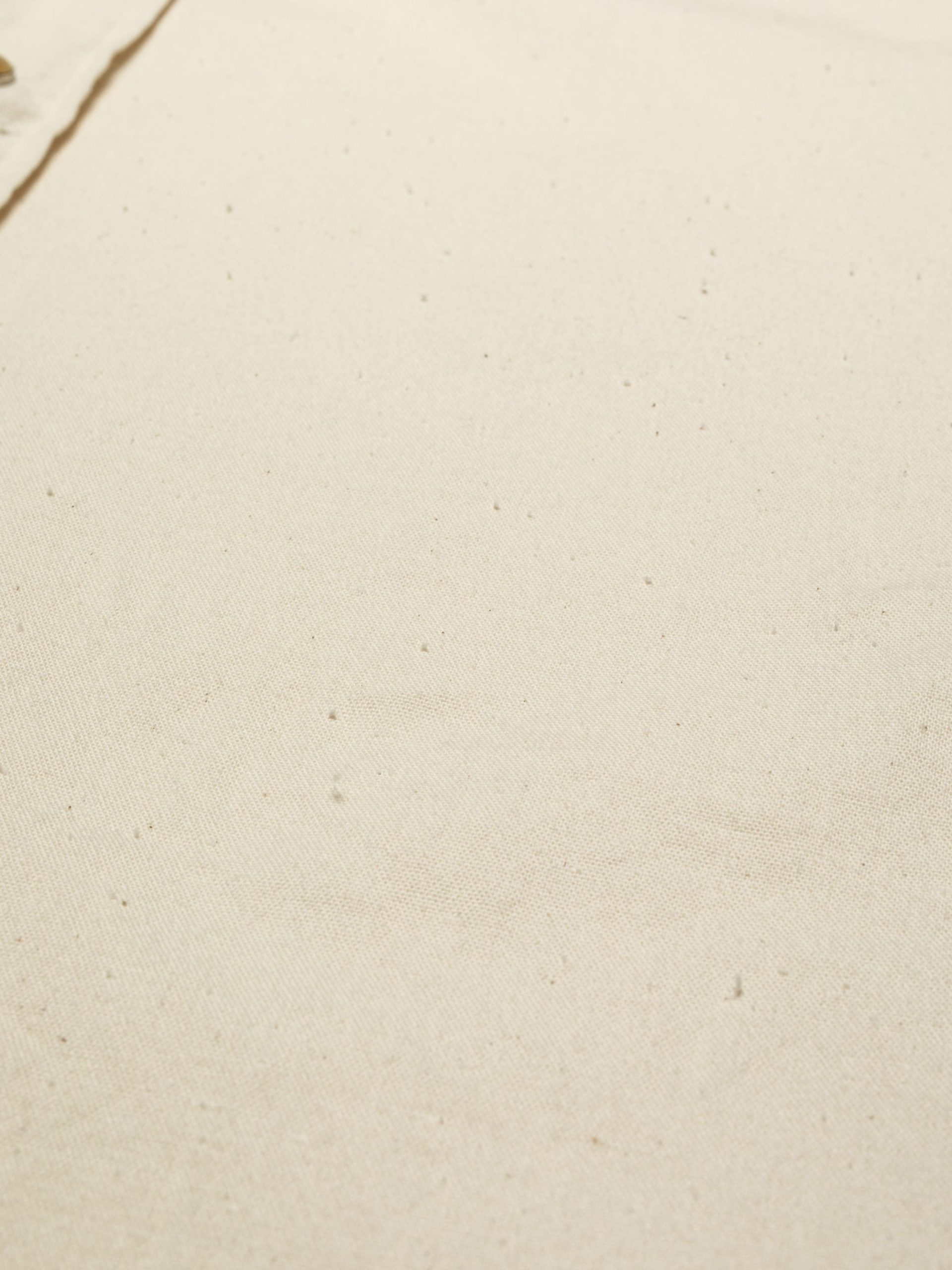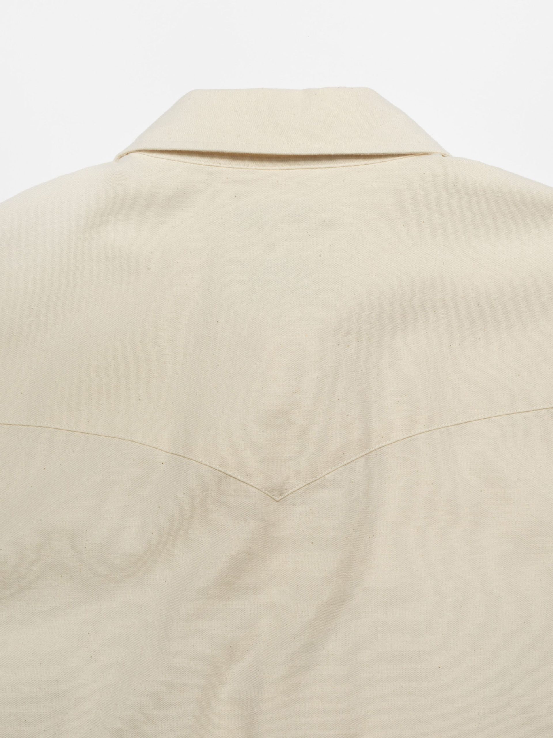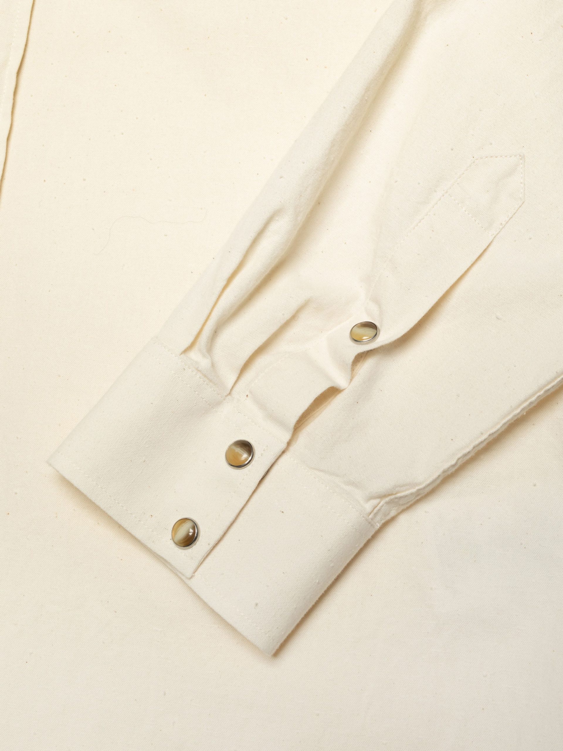 Shirt made in an ecru weave with a raw, nepsy personality. It features a pointed yoke at the front and back, a rounded two-button sleeve cuff, and a rounded bottom hem.