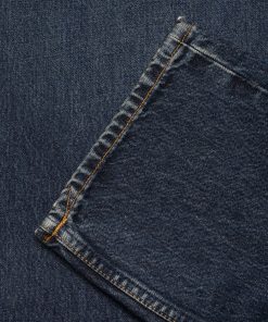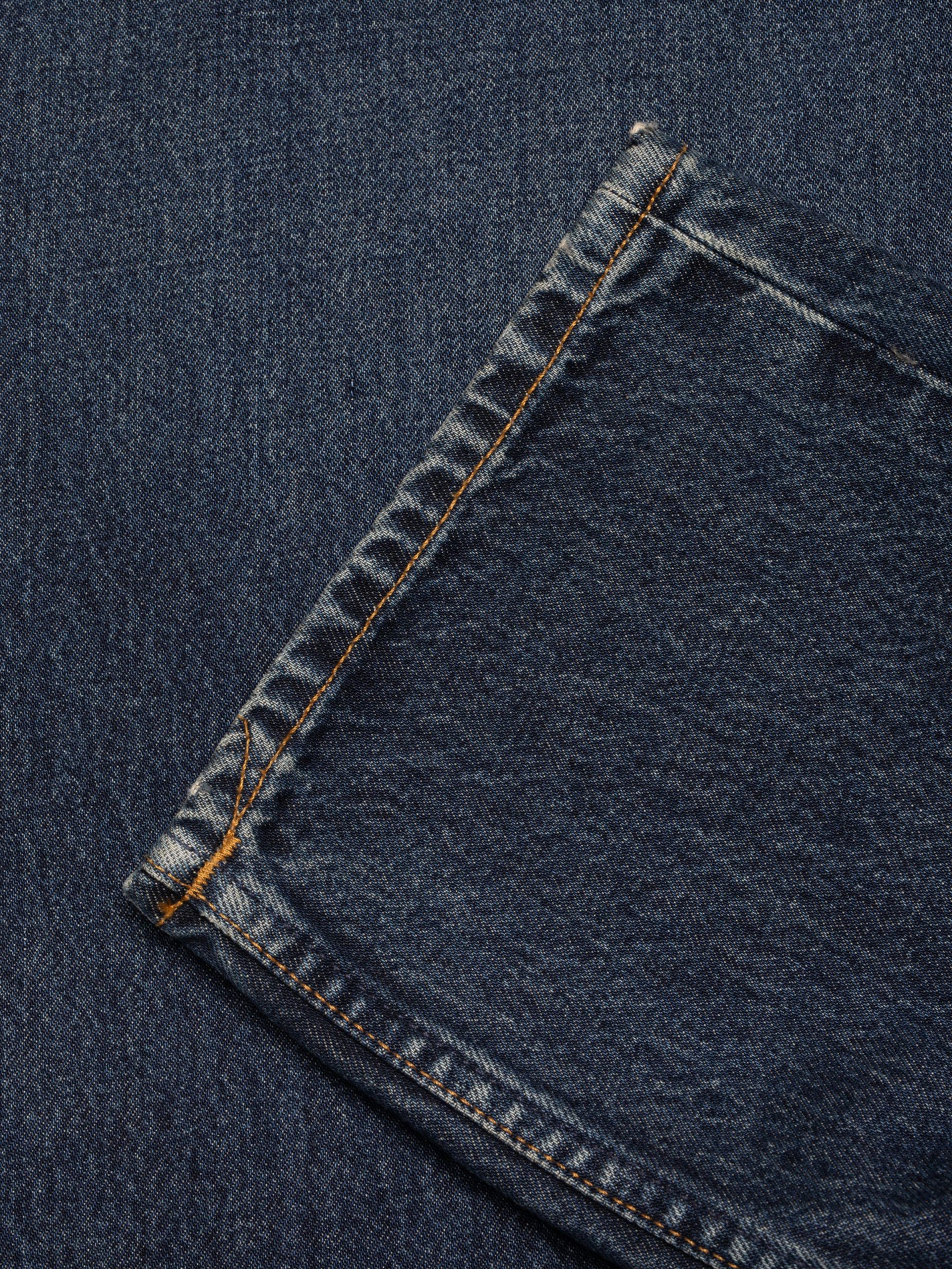 A high-waist regular-fit jean with a straight leg, in a dark blue wash with subtle wear. Although dark, these jeans got it all. They span an impressive array of indigo hues – from the darkest of the dark to muted bright blue highlights. Abraded areas add softness while the unabraded ones add a rugged marble texture.