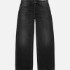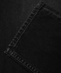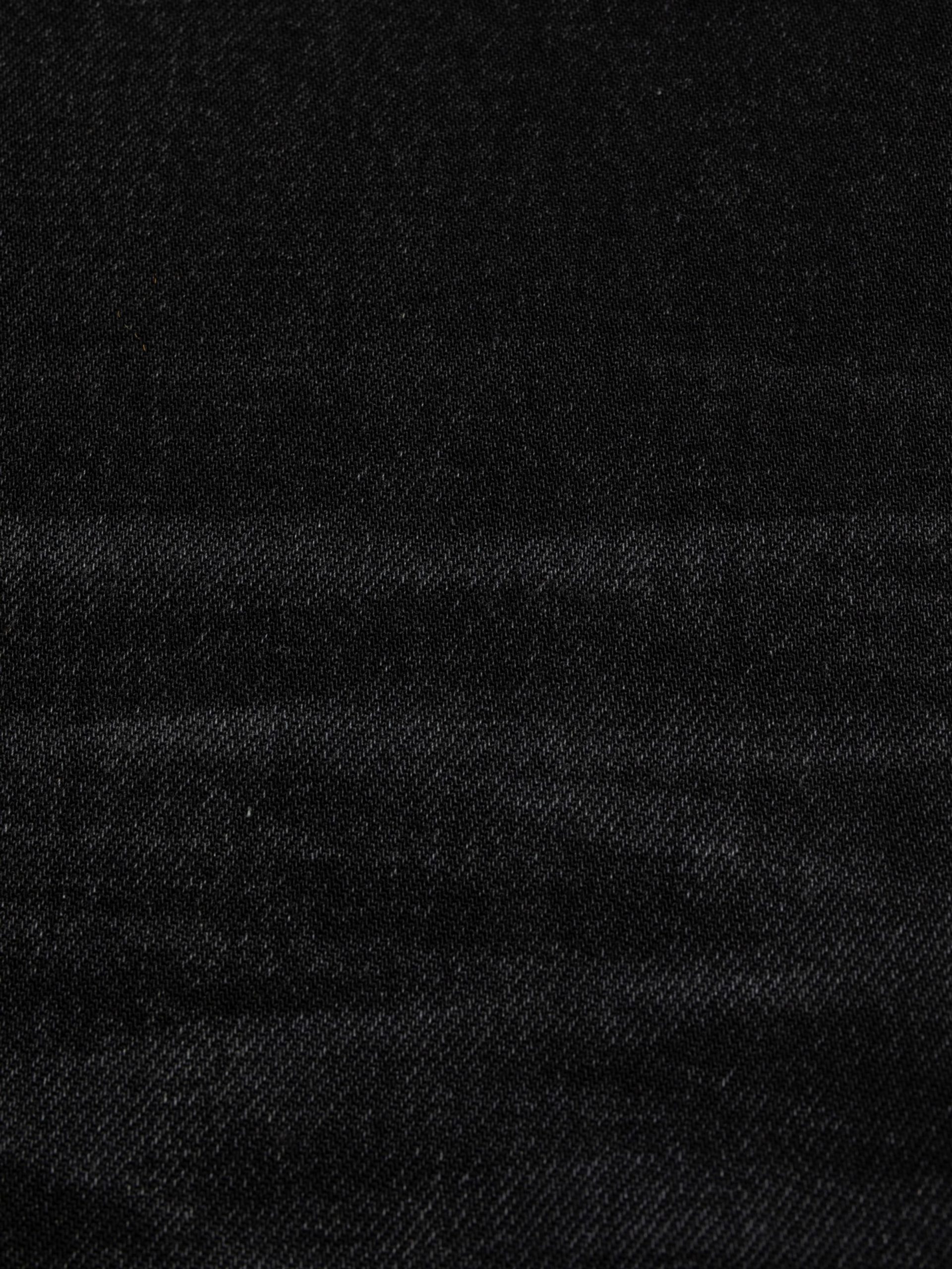 Slim-fit jeans with a slim leg, crafted from pitch-black denim with a defined texture. These jeans feature a striking contrast of highs and lows, enhanced by sharp abrasions and wear marks that deepen their worn-in look. The result is a beautifully rugged, well-aged appearance.