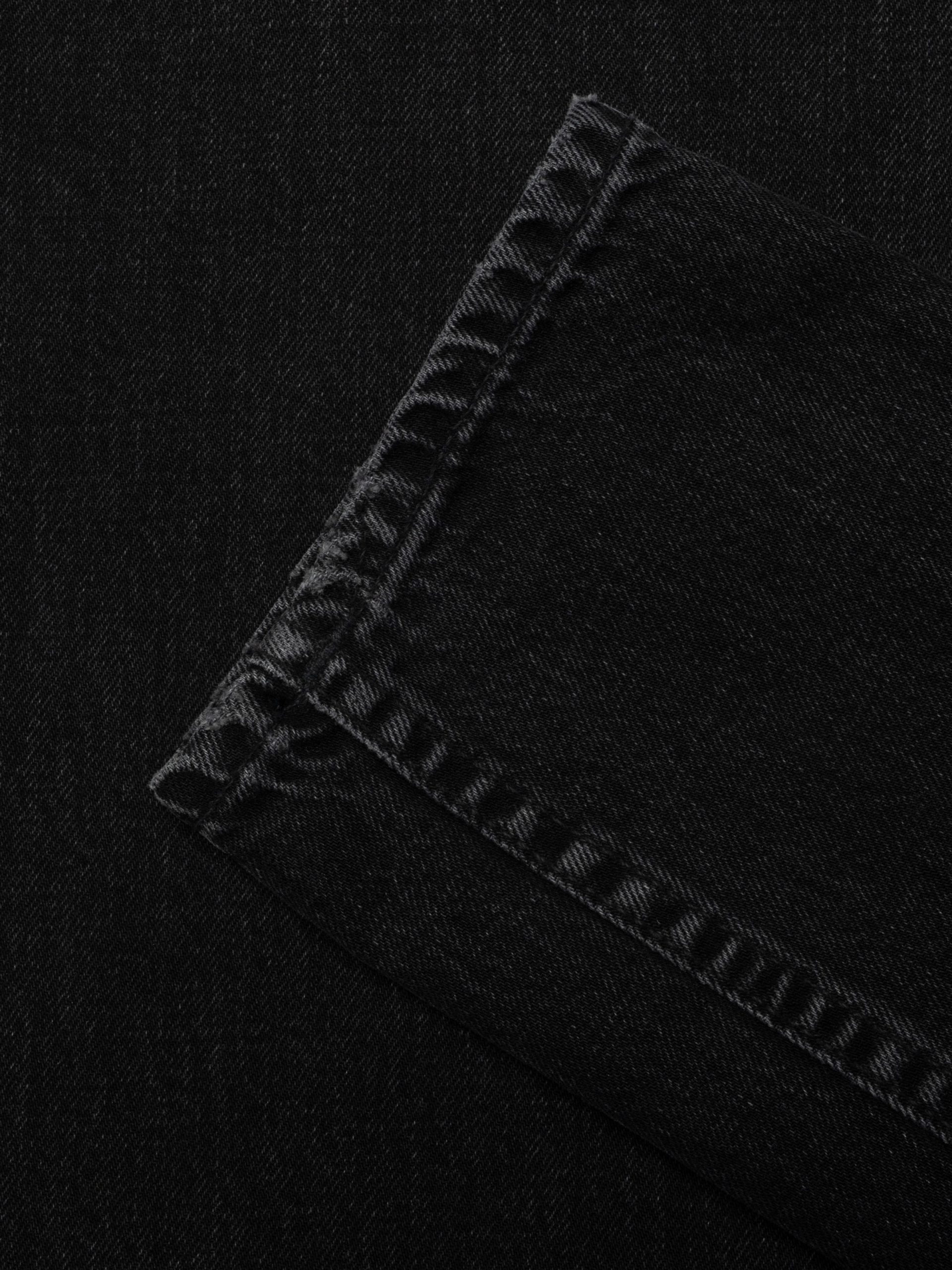 High-waist, regular-fit jeans with a tapered leg, featuring a saturated and beautifully textured black wash. Crafted from exceptional black-overdyed-black denim with pronounced slubbiness, the wash reveals a striking salt-and-pepper grain and a subtle crosshatch texture. While showcasing contrasts, the wash retains deep pitch-black tones, resulting in a wonderfully rich and dynamic black finish.rn