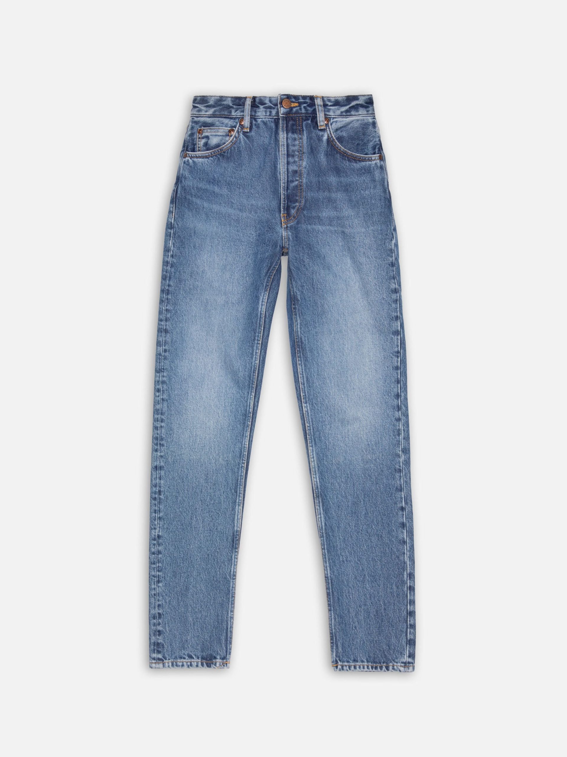 High-waist regular-fit jeans with a tapered leg in a mid-blue wash with bright contrasts. Made from organic cotton.