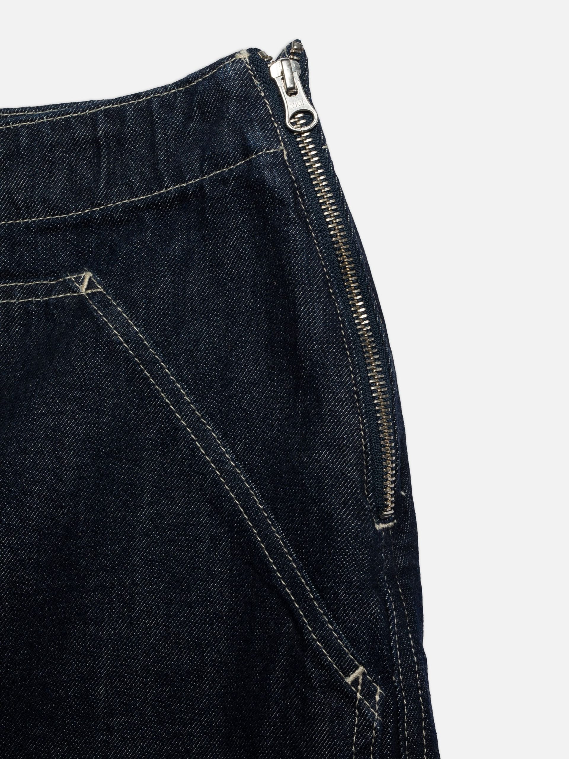 Elvy features an A-line regular fit with a high waist. Sewn with off-white thread and adorned with patch-on pockets, it’s a skillful nod to simplistic workwear with a contemporary twist.